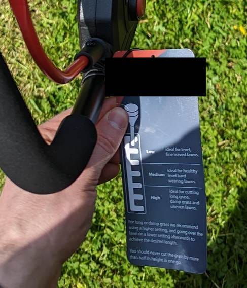 First of all, how did my buzz-cut mistake occur? Well, I set up the lawnmower by unfolding the push bar, putting in the battery, and plugging in the safety key. Then I looked at the tag attached to the push bar to check if the lawnmower was set at the right height. According to the label, the lawnmower was originally set to “low”, and I wanted it on “high”, so I reached down from my standing position behind the lawnmower and pulled the red handle to the “high” position. I made no question of this. The handle being up on the lawnmower, to indicate the high setting, was intuitive to me.